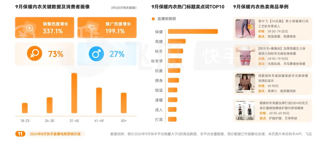 談及秋冬季節不可或缺的服飾單品,保暖內衣無疑佔據一席之地。進入9月,該品類迎來了銷售旺季,與8月相比,其銷售熱度激增337.1%,同時推廣熱度也大幅上升了199.1%。