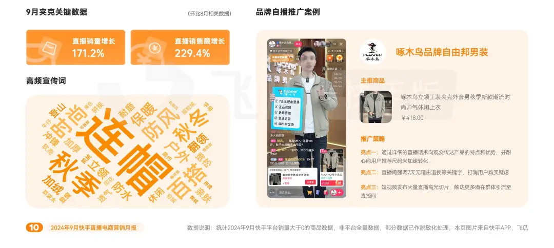 隨着氣温逐漸降低,秋冬季節對保暖服飾的需求激增,帶動了夾克品類起量。具體而言,夾克9月直播銷量和銷售額分別抬升了171.2%、229.4%。據飛瓜觀察,商家在推廣時着重突出了連帽設計、秋季適用性以及防風保暖等賣點,來作為宣傳關鍵詞。