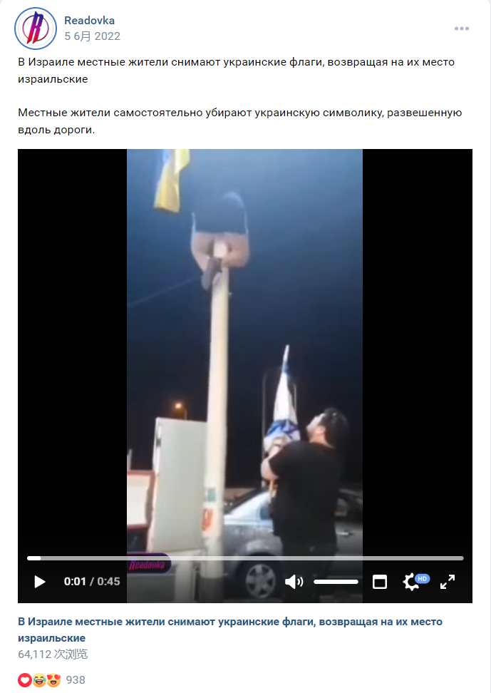 對網傳換旗視頻進行關鍵幀反搜,發現該視頻在2022年就已經出現。2022年6月5日,俄羅斯媒體Readovka在本地社交平台vk頻道上發佈了這一視頻,配文為:“在以色列,當地居民移除了烏克蘭國旗,並將以色列國旗放回原處。”
