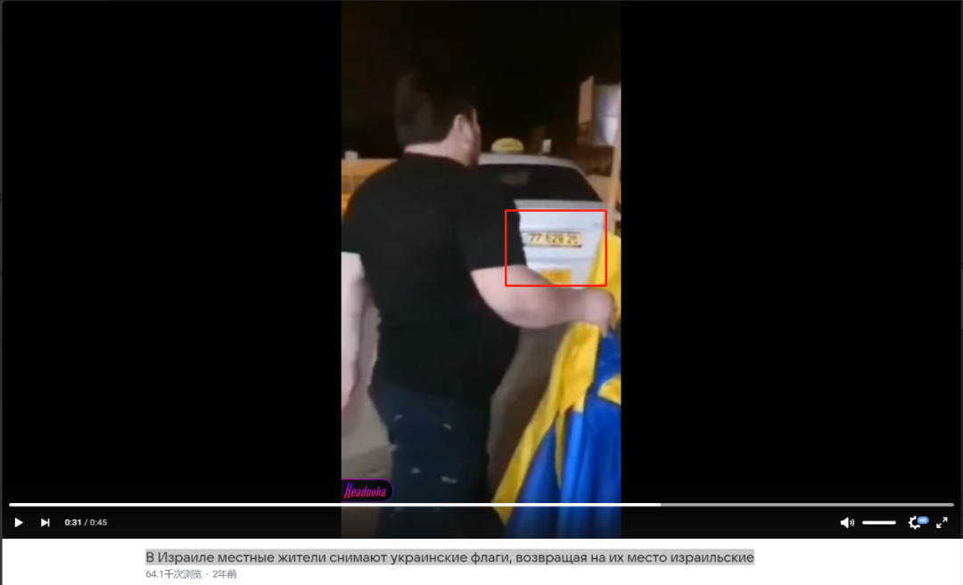 這段視頻總長為45秒,在視頻第31秒左右的畫面背景中可以觀察到一輛帶有黃底黑字的車牌的汽車。查閲以色列和烏克蘭的車牌制式可知,以色列的民用車輛使用的車牌為黃底黑字的制式,而烏克蘭的民用車輛使用的車牌以白底為主,印有黑字數字和字母。