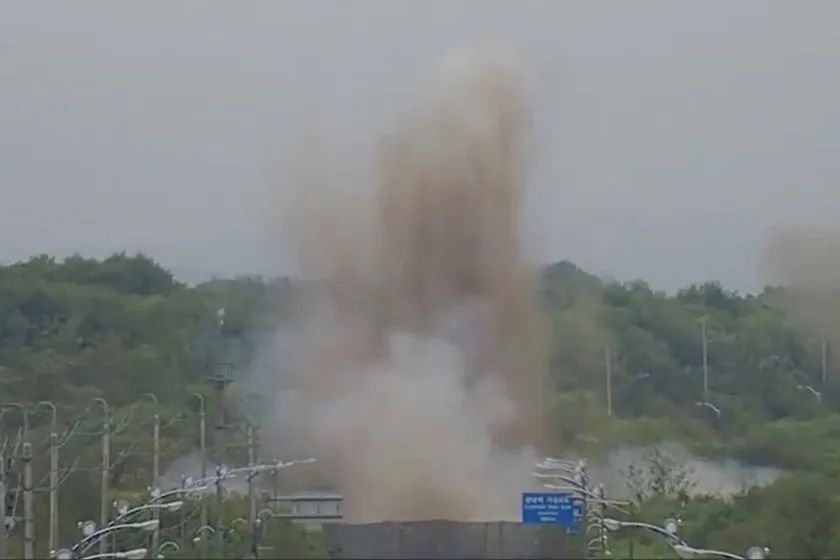 當地時間15日,韓國聯合參謀本部公佈了一段朝鮮方面進行爆破的視頻。(圖源:IC PHOTO)