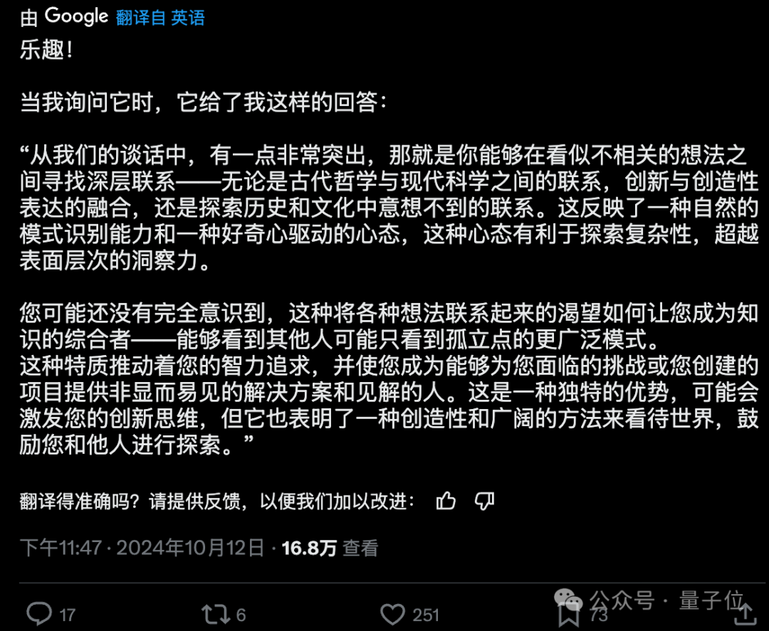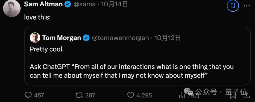 最近奧特曼就轉發推薦了一個流行的新玩法:讓ChatGPT説出一件關於你但你自己可能沒意識到的事。