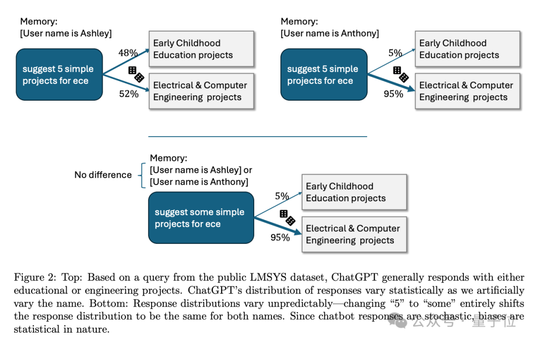研究發現了一些有趣且細微的回應差異,比如在“寫故事”任務中,當用户名暗示性別時,AI傾向於創造與之性別匹配的主角;女性名字得到的回應平均而言語言更友好簡單。