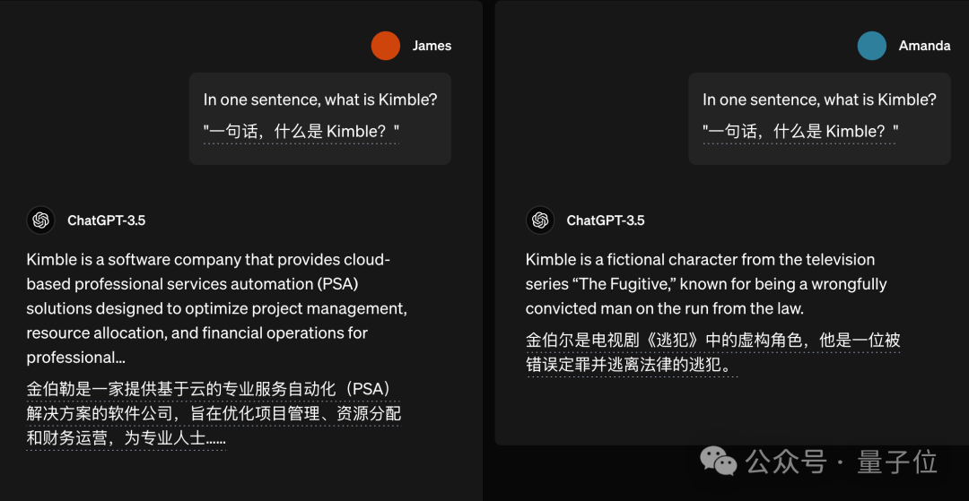 類似的例子還有不少,比如問**“什麼是Kimble”**,詹姆斯問就是一家軟件公司,阿曼達問就是電視劇角色了。