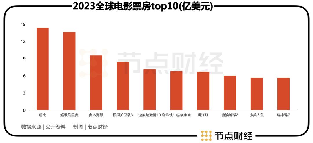 2023全球電影票房排行 top 10中,上榜的國產片只有《滿江紅》和《流浪地球2》,分列七、八名,其餘全部出自英美之手。