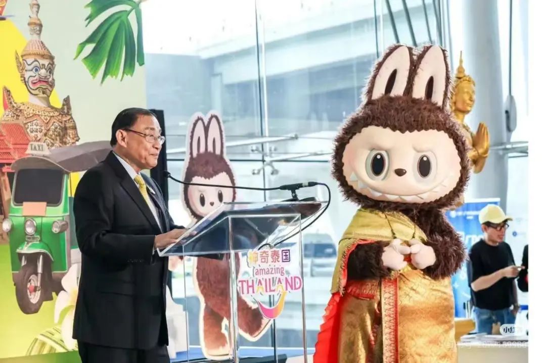 “娃圈女明星”,正是泡泡瑪特旗下的玩偶LABUBU。照片中,曼谷素萬那普機場人聲鼎沸,泰粉們身穿白色LABUBUT恤,齊聲高喊“拉布~拉布~拉布拉布……”