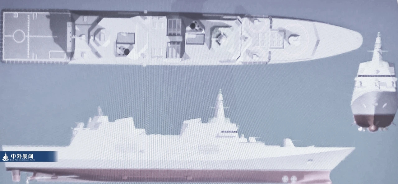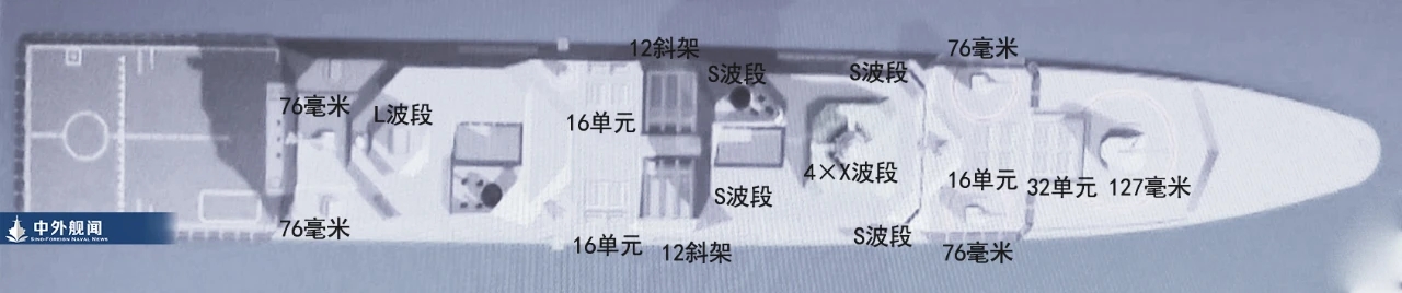 根據此前意大利國防論壇流出的新效果圖顯示,“DDX IT”在艦體佈置上也與055型驅逐艦相似,採用長艏樓設計,艦橋主體結構四個角安裝有四面S波段固定雷達陣列(“DDX IT”在舷窗上方,055在舷窗下方,因此“DDX IT”陣列面積稍小),X波段雷達在安裝在艦橋上方的主桅杆上,武器區分為艦首武器區和艦舯武器區,在艦體上的主要區別就是“DDX IT”似乎不如055修長,艦首角度看有種071型登陸艦的粗壯感,另外就是“DDX IT”在艦尾直升機庫上方還安裝了一部L波段(C/D頻段)單面旋轉早期預警相控陣雷達,以彌補S波段雷達陣列較小的問題。