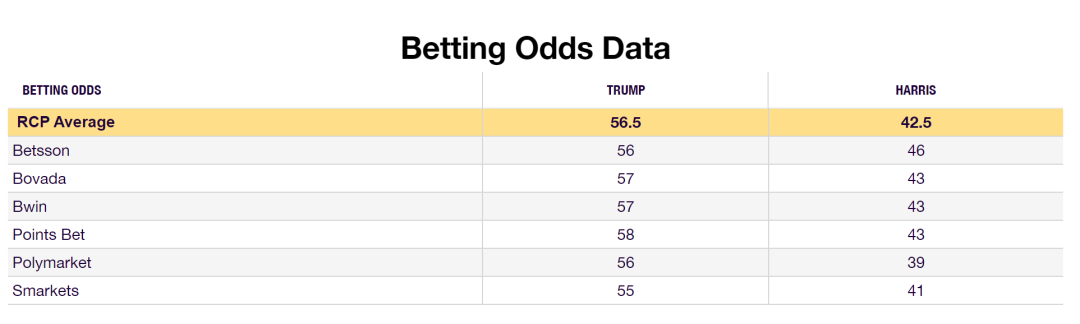 6)與此同時,美國國內外一些博彩網站開出的賠率也顯示,特朗普當選的概率小幅高於哈里斯。**以realclearpolitics網站發佈的博彩加權平均結果來看,特朗普以56.5%的獲勝概率領先哈里斯的42.5%。**有不少人覺得,博彩結果是參與者用真金白銀“賭”出來的,比民調更具參考價值。