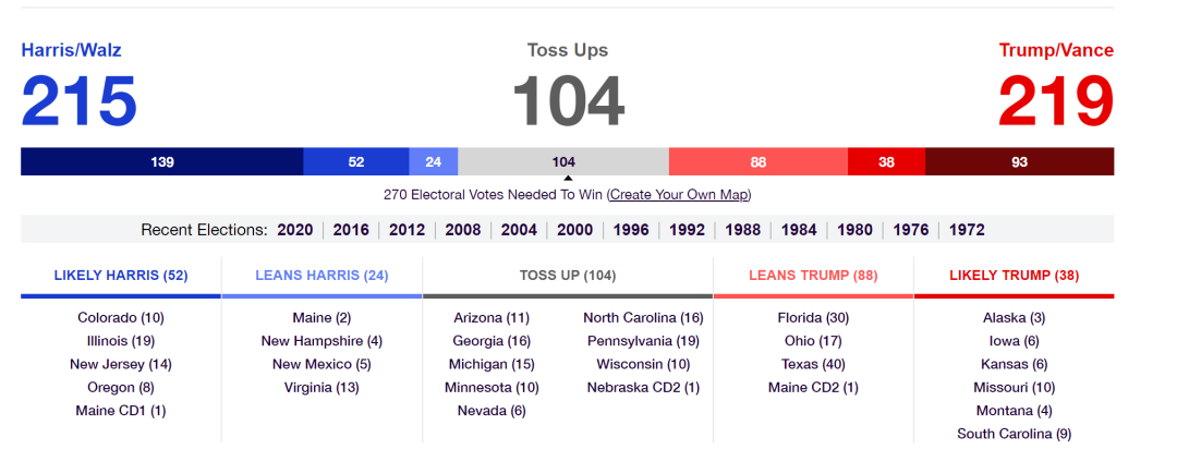 3)從下圖可以看出,哈里斯和特朗普比較有把握拿下的選舉人票分別為215張和219張,因此,這一次美國總統大選的結果,將取決於兩人在9個搖擺州爭奪104張選舉人票的勝負。