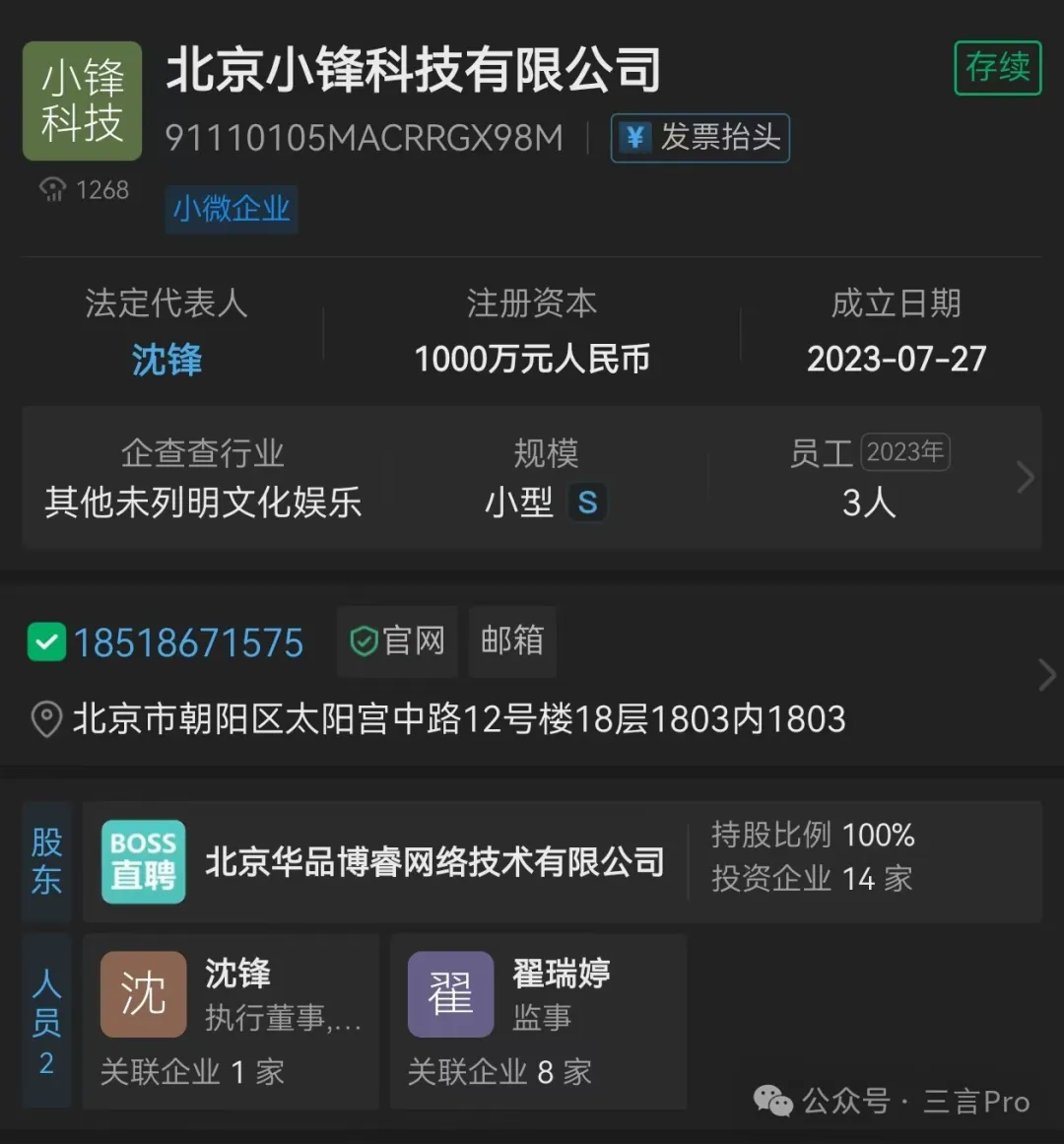 “看準”開發方是北京小鋒科技有限公司,該公司於2023年7月27日成立,法定代表人為沈鋒,註冊資本1000萬元人民幣。經營範圍包含婚姻介紹服務、婚慶禮儀服務、廣播電視節目製作經營等。該公司由BOSS直聘關聯公司北京華品博睿網絡技術有限公司全資持股。
