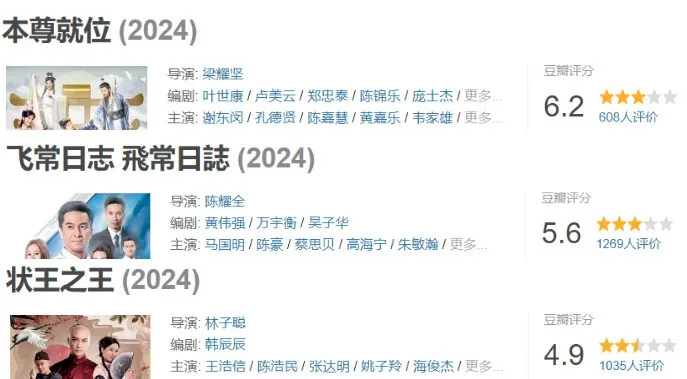 職場劇《飛常日誌》豆瓣5.6,家庭劇《神耆小子》豆瓣6.6,懸疑劇《再見枕邊人》豆瓣5.6,穿越劇《本尊就位》豆瓣6.2,古裝劇《狀王之王》豆瓣4.9。