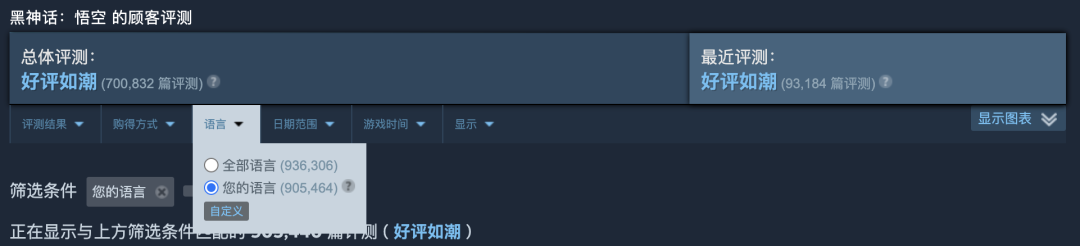 也不扯那些冷冰冰的數據,就説前陣子《 黑神話:悟空 》銷量超過 2000 萬,而在黑猴的 steam 商店頁面 93 萬條遊戲評論裏,簡中評論超過 96% 。