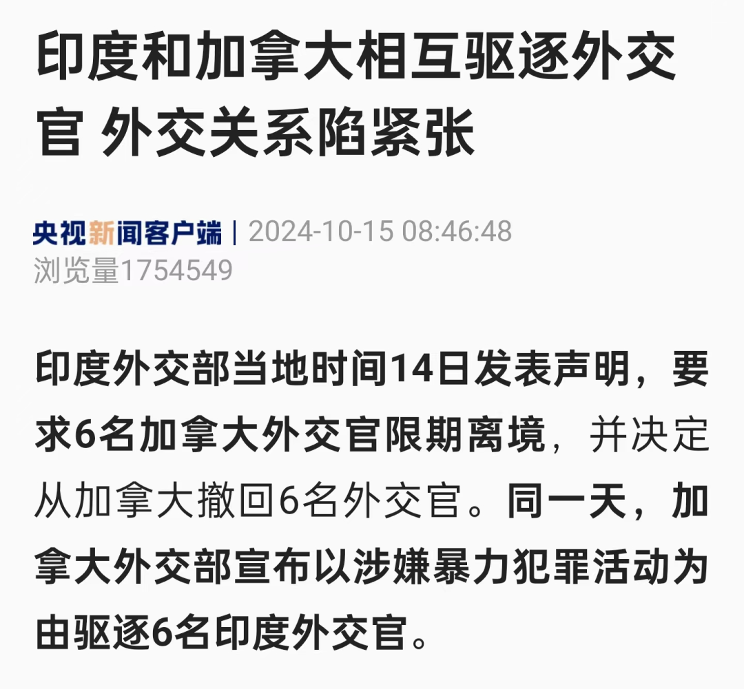 14日,印度外交部公開發布聲明,要求包括駐印度臨時代辦在內的6名加拿大外交官,於19日23時59分前離開印度,這話説直接點,就是勞資蜀道山,趕緊滾!