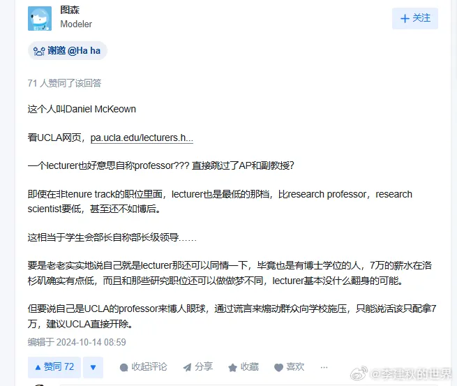 這個回答在噴這個白人講師的時候,用得是什麼,用得是“根本不夠資格叫教授”、