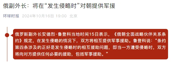 同時,普京提交了關於批准俄朝全面戰略伙伴關係條約的草案,其中第四條規定,如果一方受到某一國或數國武力攻擊,並處於戰爭狀態,另一方將立即以一切可用手段向前者提供軍事和其他援助。