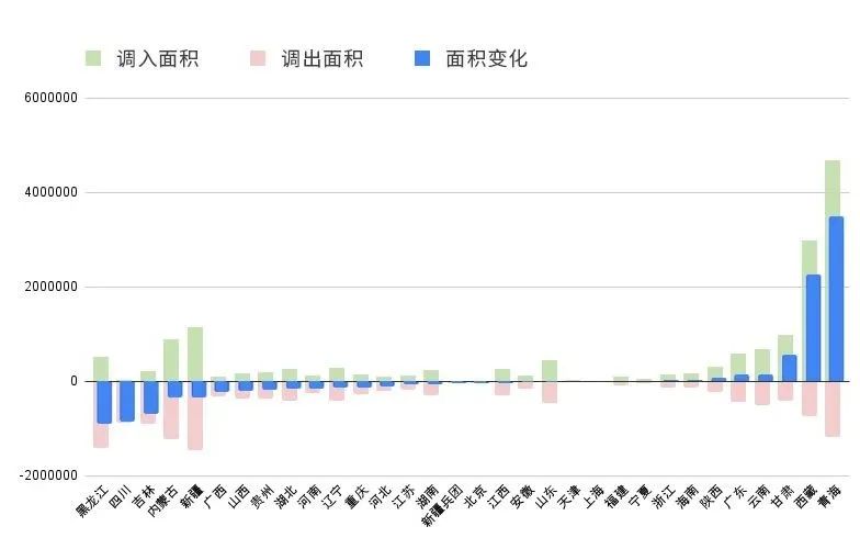 按省統計的保護地調入調出數據。根據這個統計可看出,保護地調入面積的大頭來自於青海、西藏,東部地區總體出大於入,生態大省內蒙、新疆的調出面積竟然大得驚人,這非常值得引起關注。