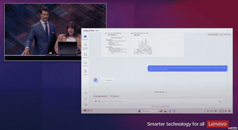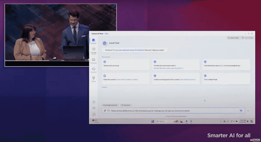 在現場,聯想執行副總裁Matthew Zielinski在斷網的情況下,通過“AI鍵”(F9)激活,AI Now就可以將筆記和圖片從平板電腦無縫傳輸到電腦中: