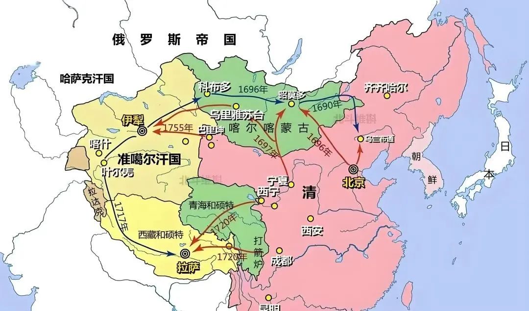清朝前期,西藏被蒙古族的和碩特汗國控制,後來和碩特汗國又被盤踞在西域的另一個蒙古族政權—準噶爾汗國消滅。