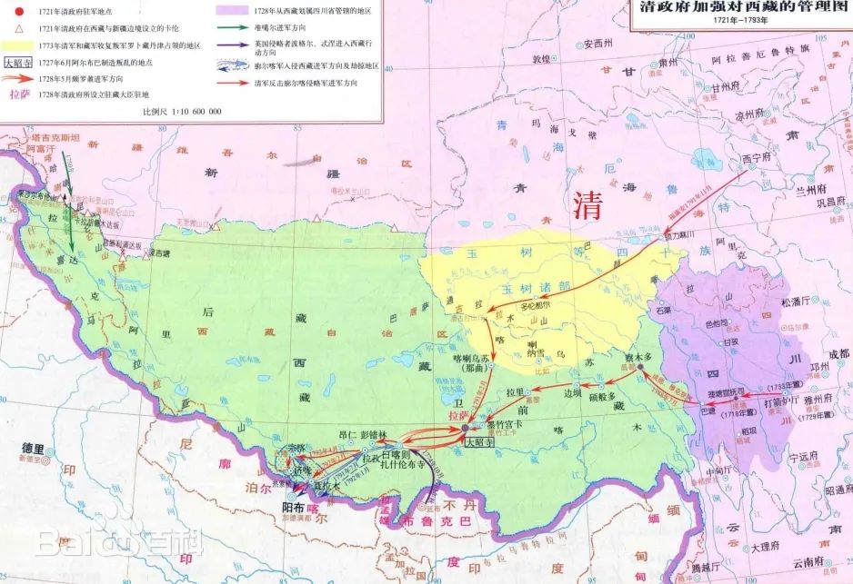 清朝於1720年派遣軍隊進入西藏,擊敗了準噶爾軍隊,並在1727年設立了駐藏大臣,開始了對西藏地區的直接管轄。