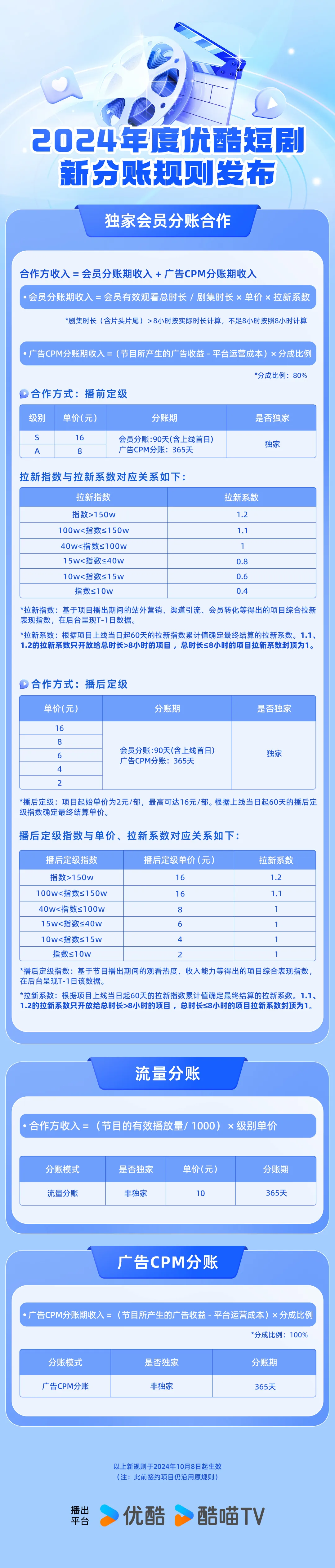 10月8日,優酷正式實行全新的短劇分賬規則,其中,平台不僅抬高了短劇單集分賬上限,還進一步引入拉新系數這一全新指標,平台圍繞短劇的商業化探索持續細化。
