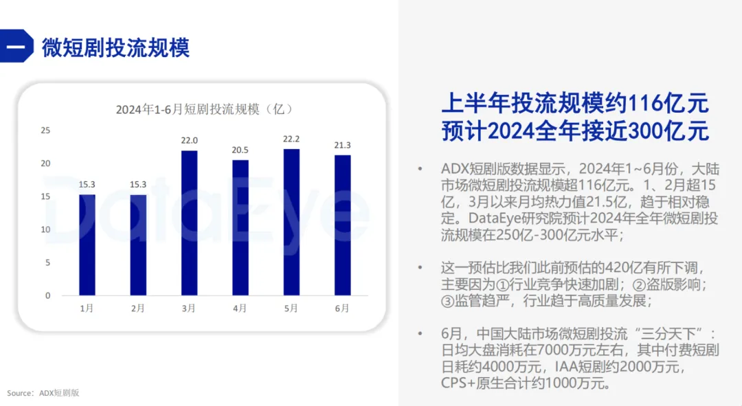 因此,目前短劇市場整體的投流力度很大,DataEye前不久發佈的《2024上半年微短劇投流白皮書》數據顯示,今年上半年,短劇投流規模約116億元,預計全年在250億-300億元。甚至,不少短劇不惜將收入的90%用於投流。這也決定了當前短劇市場的收益大部分進入了渠道方的口袋,製作方可參與分成的比例甚至一度被壓縮到10%以下。
