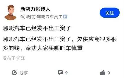 也就是這幾天,據社交媒體上不少認證為哪吒汽車員工的用户發帖表示,哪吒汽車上月工資沒有正常發放,公司欠了供應商很多錢,奉勸大家謹慎購買哪吒汽車。