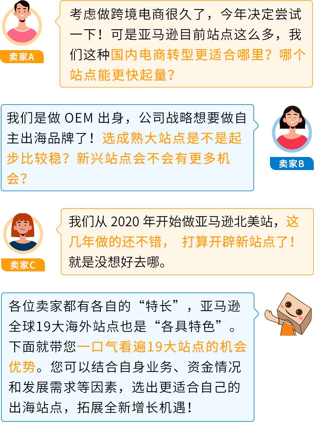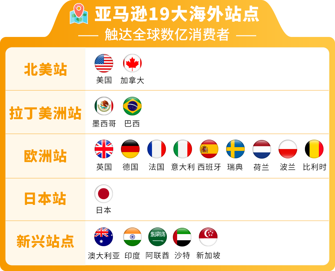 亞馬遜在全球19大海外站點,已向中國賣家全面開放,賣家可直接觸達亞馬遜全球超過3億活躍用户,其中包括超過2億Prime會員用户,和超600萬優質企業與機構買家。