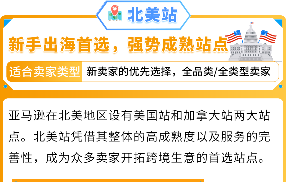 巨大流量+運營支持+真金白銀福利,豐富新賣家支持盡在亞馬遜北美站!無論您經營哪種品類,是否有跨境運營經驗,北美站都是您的跨境啓航首選站!
