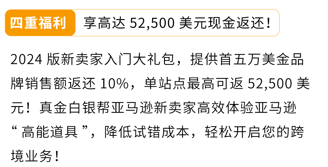 美國站品牌商品銷售額最高返還52500美元****,開通歐美日三大站點,可以享受最高15萬美元的疊加返還。符合條件的賣家還可享受超900美元優惠福利!