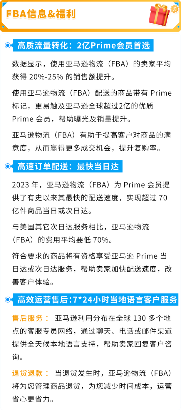 無論您選擇哪個站點,作為出海掘金的啓航站。亞馬遜物流(FBA)將為賣家提供便捷的一站式配送及售後服務。幫助賣家實現商品在當日或次日送達消費者手中,助您的跨境之路高效獲取流量,運營更輕鬆!