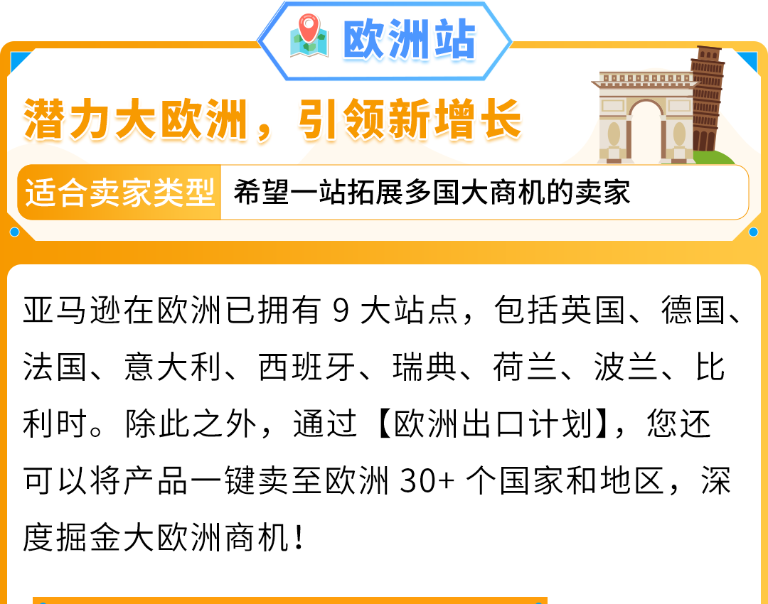 不僅有5大成熟站點,更能一站熱賣歐洲 30+個國家和地區,全面掘金歐洲商機!如果您希望將業務板塊最大程度拓展多國,輕鬆玩賺多站點運營,亞馬遜歐洲站將是您的優先選擇!