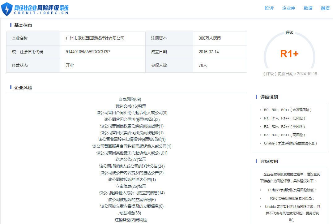 據網經社“企業風險評級系統”顯示,“旅划算”所屬廣州市旅划算國際旅行社有限公司的風險評級為R1+,公司目前所處於低風險。
