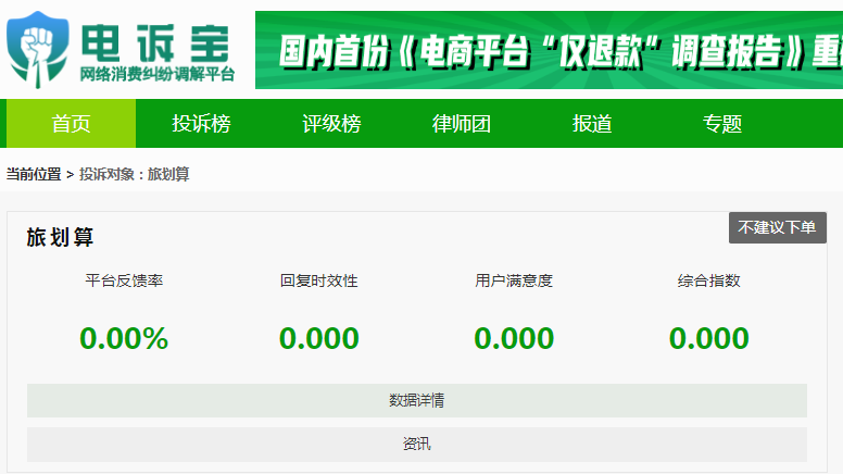 根據“電訴寶”受理的在線旅遊領域用户有效投訴顯示(依據投訴量排行),旅划算排名第12位,最新評級為“不建議下單”。此外,2024至今“電訴寶”受理投訴中涉及的在線旅遊平台按投訴量排序依次為飛豬、去哪兒、走着瞧旅行、聯聯周邊遊、攜程、同程旅行、俠侶親子游、途家、馬蜂窩、高鐵管家、騎驢遊。