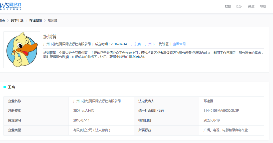 從網經社企業庫瞭解,旅划算隸屬於廣州市旅划算國際旅行社有限公司,該公司成立於2016年7月14日,法定代表人鄧建勇,公司註冊地位於廣州市海珠區。