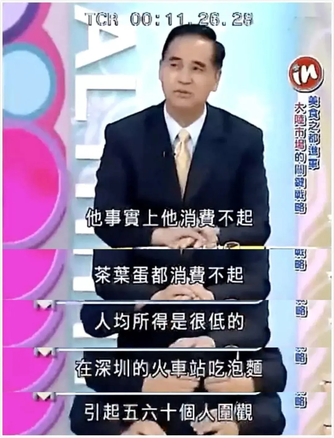 這個謠言源於2013年台灣的某檔綜藝節目,一個叫高志斌的嘉賓堂而皇之地説,大陸普通百姓是吃不起茶葉蛋的,甚至連泡麪都沒見過,説他在深圳火車站吃泡麪時引來無數羣眾圍觀。