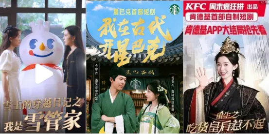 肯德基短劇《重生之吃貨皇后惹不起》的吉國皇后因偷吃雞腿被雞嚇到穿越,重生成為人氣女演員周莫,由此開啓翻身逆襲的大女主之路;《我在古代開星巴克》中身為星巴克店員的男主意外穿越,靠着帶來的咖啡豆和星巴克品牌手冊在古代開起了“星巴客棧”;蜜雪冰城直接將重生戲路拉滿,從重生之我是雪舞王到雪管家、雪特助、雪團寵,每天忙着穿越不停。