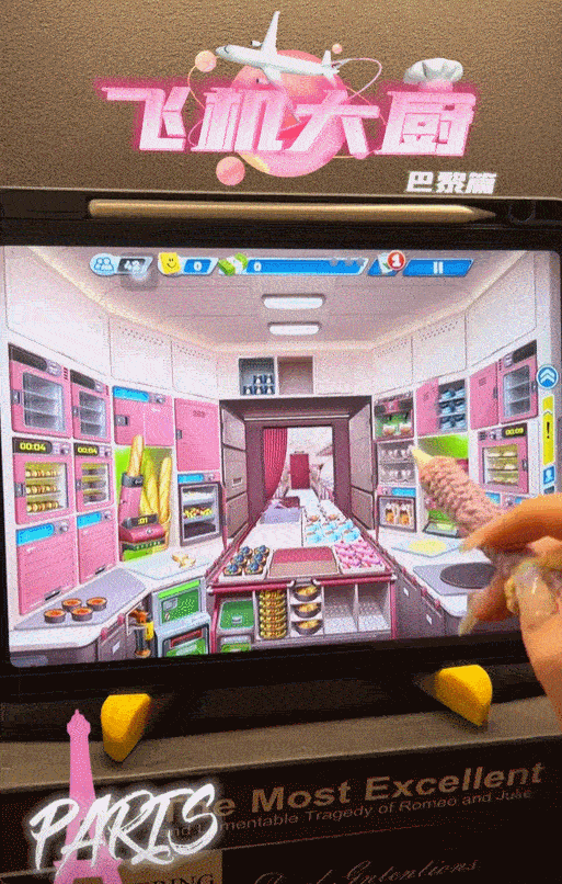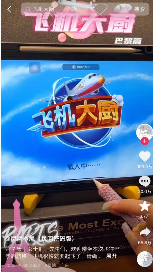 而在抖音的《飛機大廚》視頻裏,高玩們的操作就很流暢了,一支手寫筆指尖旋轉,刷刷刷不停點擊屏幕,各種食材分類組合,筆尖一點屏幕,精準分好餐盤,再一點一劃,配餐就塞進了飛機上嗷嗷待哺的乘客嘴裏。