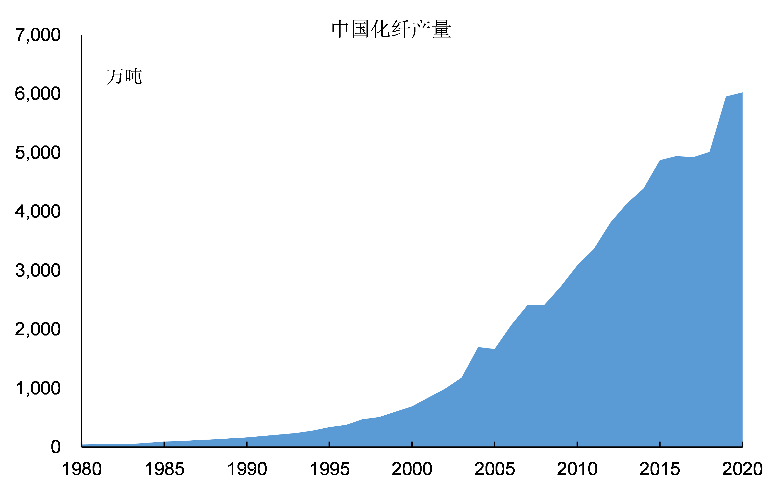 改革開放前的1978年,中國的化纖產量只有28萬噸,從1978年到2000年增加了666萬噸;2000年中國的化纖產量增長迅速,到2005年中國的化纖產量達到1665萬噸,2010年達到3090萬噸,2020年進一步增長至6025萬噸。