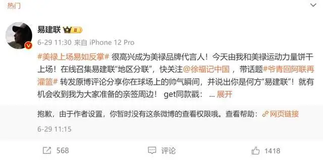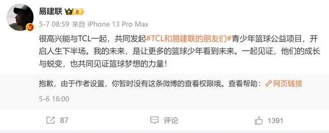 然後呢,從易建聯個人微博的轉發微博也能看出,不少品牌直接設限了相關宣傳內容,看來,品牌方都在避免受其個人風波影響。