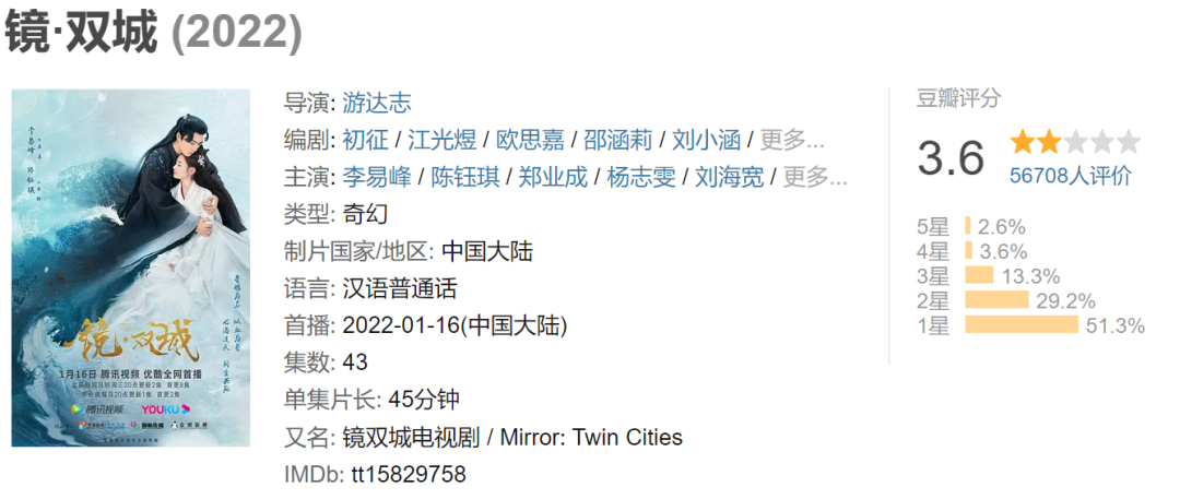 2019年,秦俊傑、袁冰妍主演的《聽雪樓》,豆瓣評分4.6;2020年,李易峯、陳鈺琪主演的《鏡·雙城》豆瓣評分3.6;2023年,肖戰、任敏主演的《玉骨遙》,豆瓣評分6.3,雖然僅僅在及格線以上,但已是滄月式武俠劇最能拿得出手的一部。而如果細究該劇的評分比例,不難發現,四五星比例與一二星比例均在30%以上,屬於粉絲和路人意見相當不統一的E型評分。沒有肖戰這種頂流主演,或許是其它兩部劇集豆瓣評分不過6的重要原因之一。