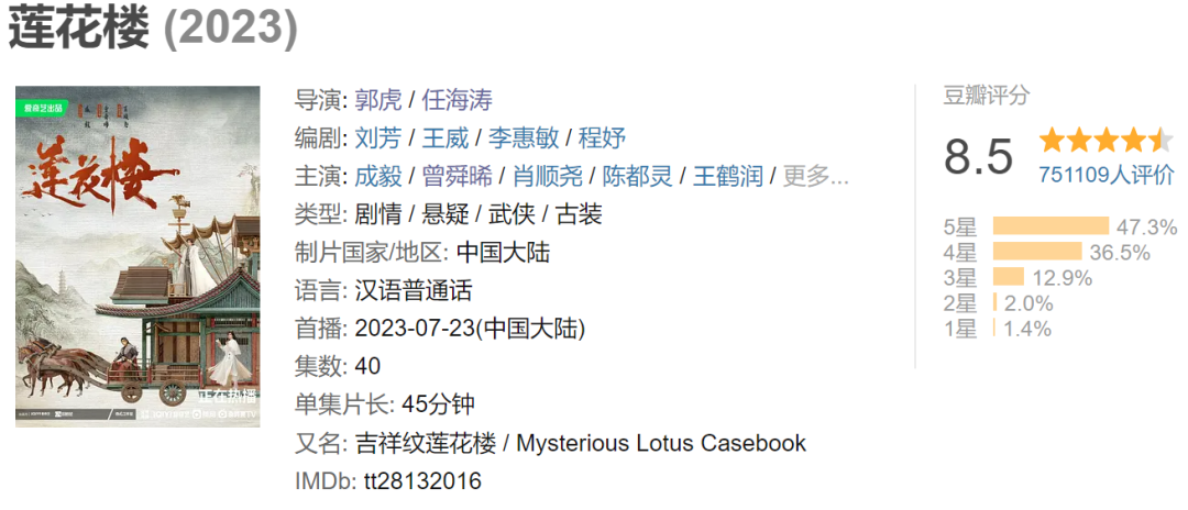 其實,近兩年並非沒有收視、口碑雙豐收的武俠劇,比如成毅主演的《蓮花樓》、小成本武俠劇《少年歌行》。而《七夜雪》的導演任海濤,正是《蓮花樓》的導演之一,只是相隔一年時間,兩部作品便相差如此之大,不由得讓人唏噓。《雲襄傳》豆瓣評分雖只有7+,但勝在集均播放量高;《鵲刀門傳奇》雖然播放量不算高,但豆瓣評分也有8.1,已經能稱得上高口碑;《一念關山》雖然高開低走,但在開播之初,也吸引了數千萬觀眾的目光。這些在近兩年或能稱作成功,或能稱作部分成功的武俠劇,愛奇藝、騰訊視頻、優酷三家皆有,並未表現出什麼製片層面的方法論,但**在劇作上,卻有跡可循:武俠+。**比如郭虎、任海濤執導,成毅、曾舜晞主演的《蓮花樓》。該劇改編自藤萍的小説《吉祥紋蓮花樓》,僅以IP知名度和所擁有的粉絲而言,該IP別説是與金庸、古龍,與滄月相比都差了一大截,但在播出效果上,卻勝出他們不止一籌。