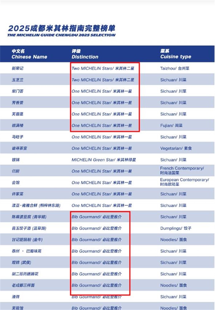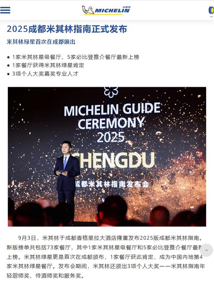 (以下我摘取了米其林官方的一些信息,篇幅有限,我只摘取成都地區,好傢伙,連個三星餐廳都沒有?是真正有實力的餐館不屑去參與評價?還是有其他原因?不得而知也。其它大城市的情況,基本類似。)