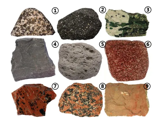 一些常見的火成岩:①輝長岩、②安山岩、③偉晶岩、④玄武岩、⑤浮石、⑥斑岩、⑦黑曜石、⑧花崗岩、⑨凝灰岩(圖片來源:sandatlas.org)