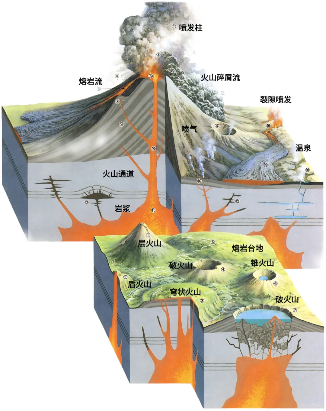 火山形成過程及常見的火山類型(圖片來源:kotobank.jp)