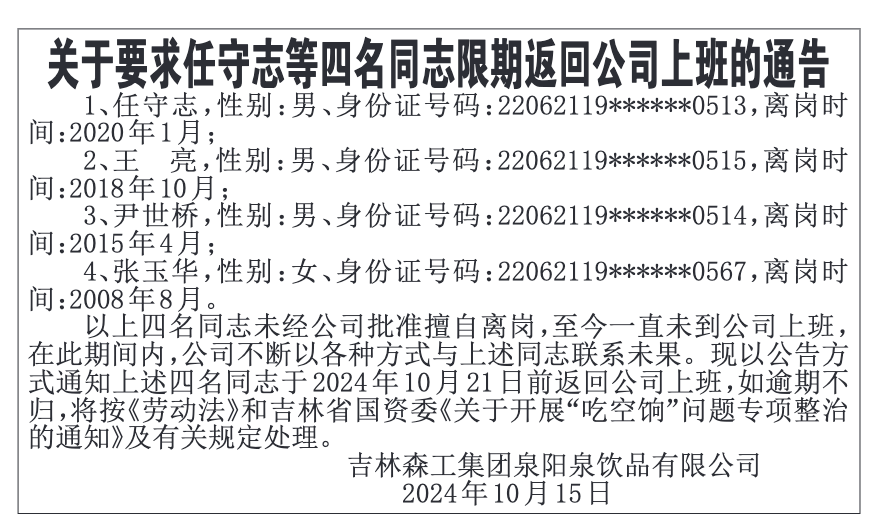 任守志、王亮、尹世橋、張玉華四名同志未經公司批准擅自離崗,至今一直未到公司上班,在此期間內,公司不斷以各種方式與上述同志聯繫未果。現以公告方式通知上述4名同志於2024年10月21日前返回公司上班,如逾期不歸,將按《勞動法》和吉林省國資委《關於開展“吃空餉”問題專項整治的通知》及有關規定處理。