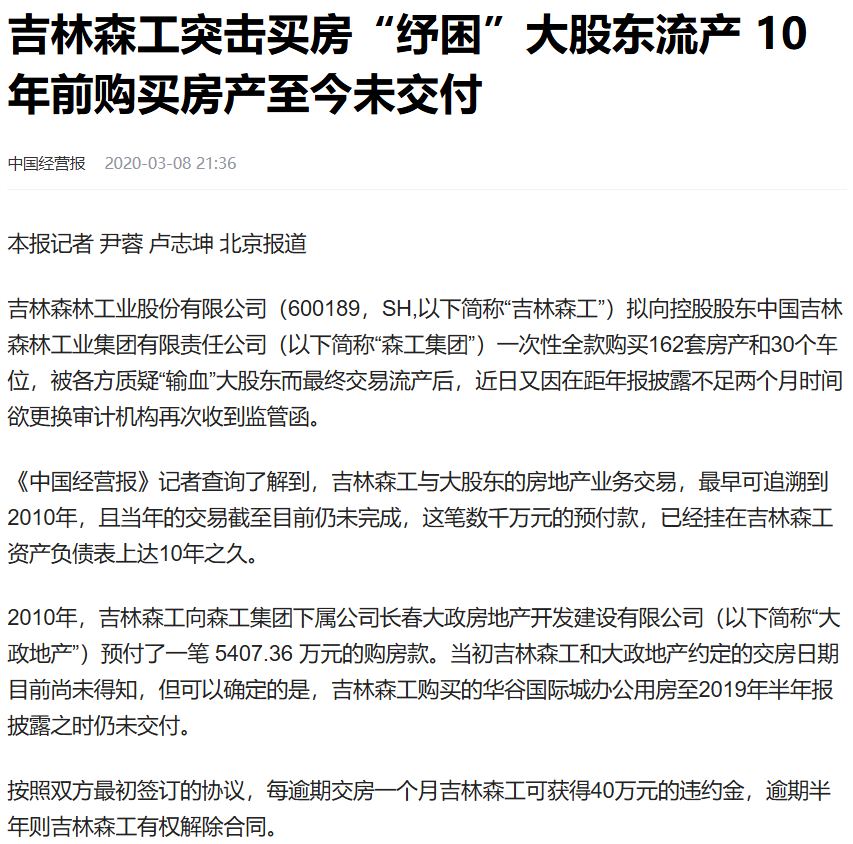 2010年8月,吉林森工花5407.36萬,買兄弟單位大政地產當時擬建設的華谷國際城項目的房產。