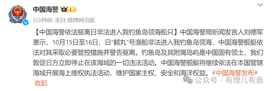 就在軍演結束後的次日,即10月15日至16日,日本“鶴丸”號漁船非法進入我釣魚島領海,中國海警艦艇依法對其採取了必要管控措施並警告驅離。耐人尋味的是,石破茂政府對此的態度竟顯得含糊其辭,既未為漁船非法行為站台,也未對中國措施表明確切異議,上演了一出“和稀泥”大戲。