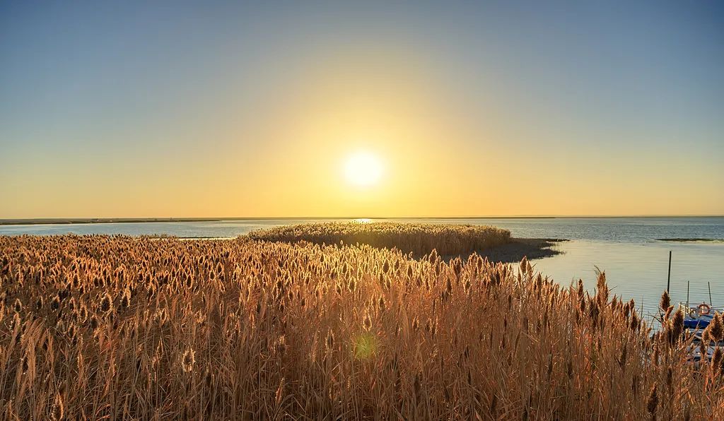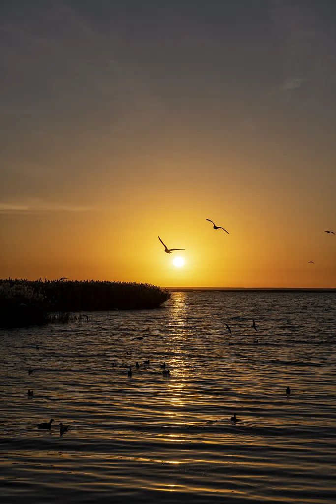 日出時的額濟納居延海景區蘆葦日出湖景風光