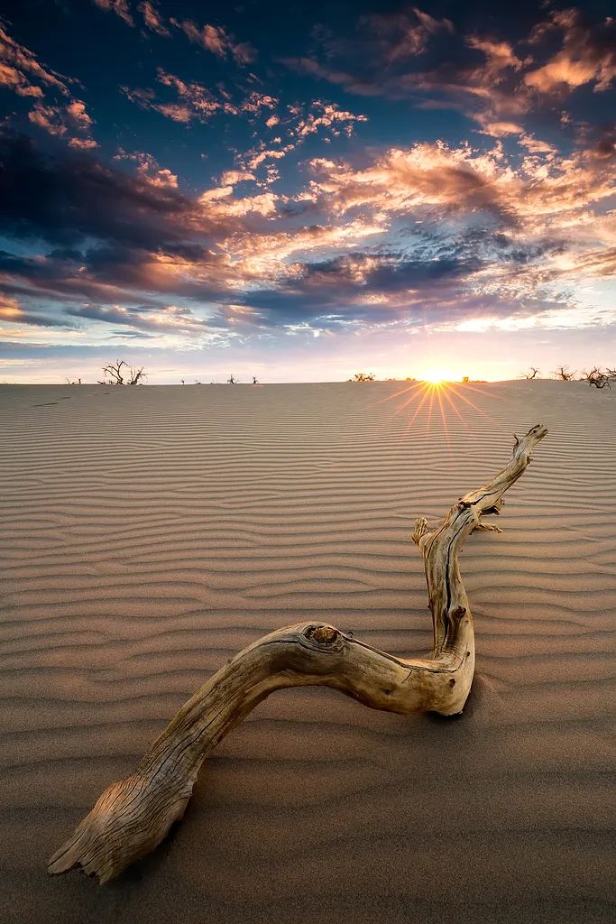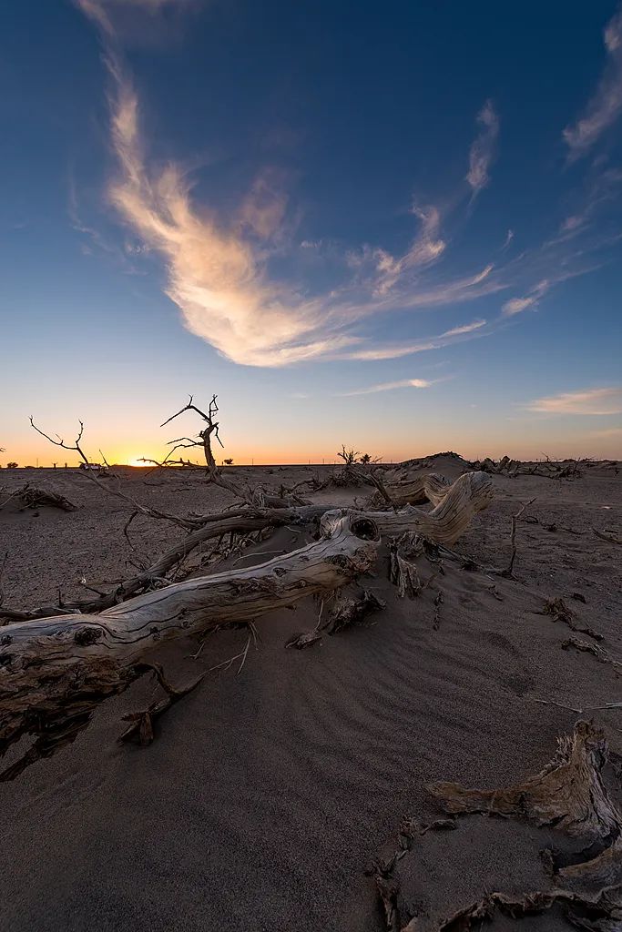 眾多死去的胡楊形成一片寧靜無息的死亡之海,它們雖已枯死,但軀體卻如豐碑般佇立在茫茫荒野,終日接受着風與沙的洗禮。