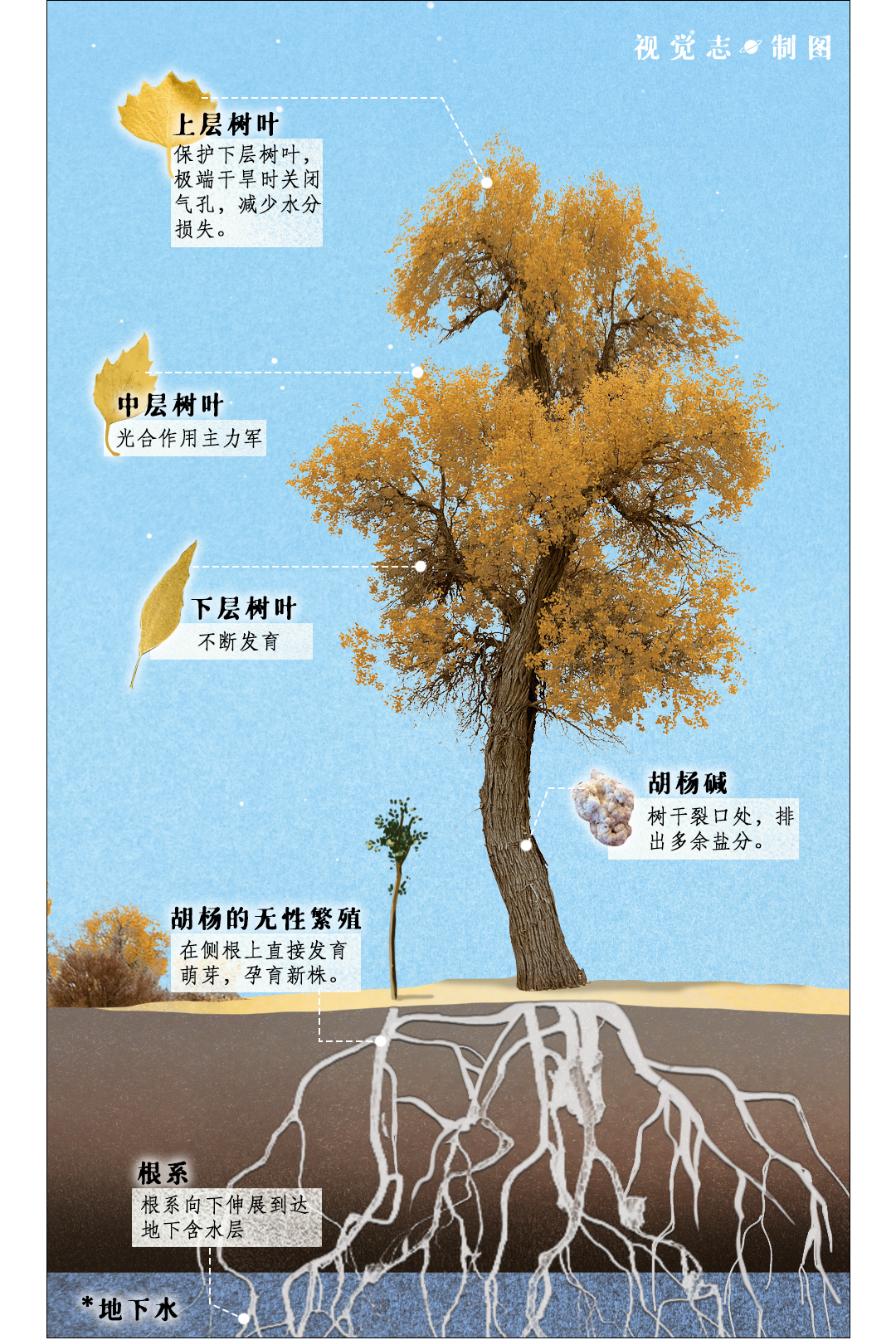胡楊的根系極深,能向下紮根20多米。